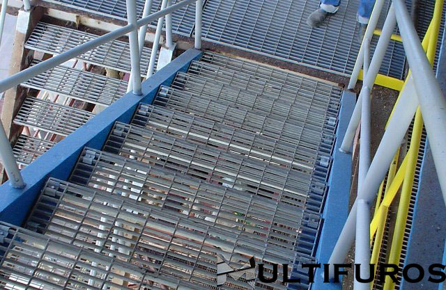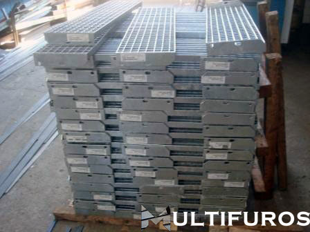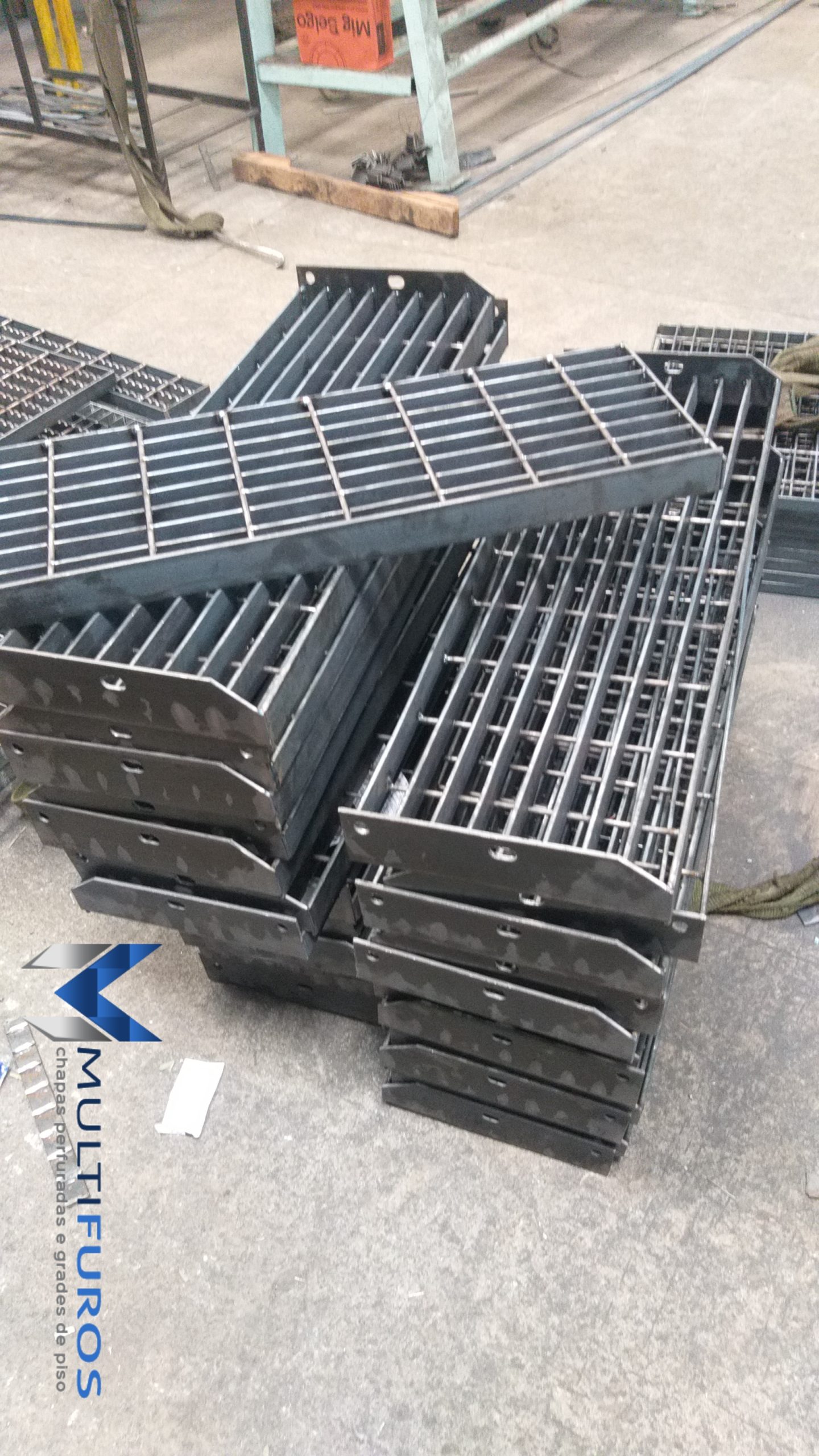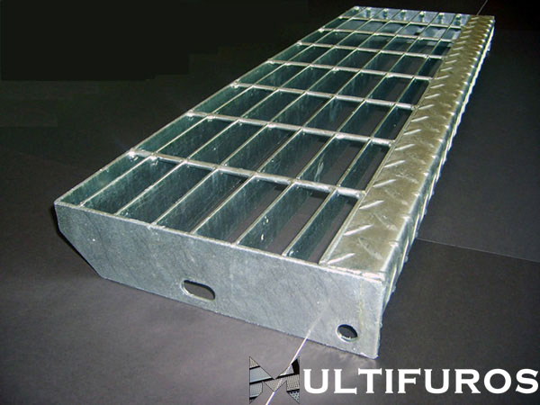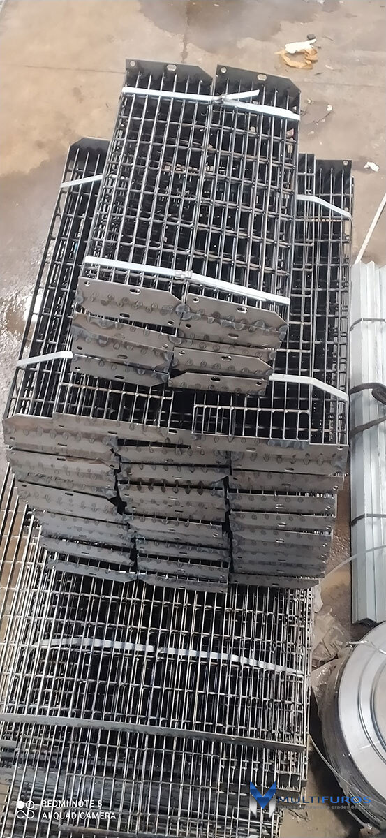 Os degraus seguem os mesmos critérios que das grades para pisos, ou seja, obedecemos aos mesmos padrões de malhas, porém acompanham em sua lateral abas para fixação.